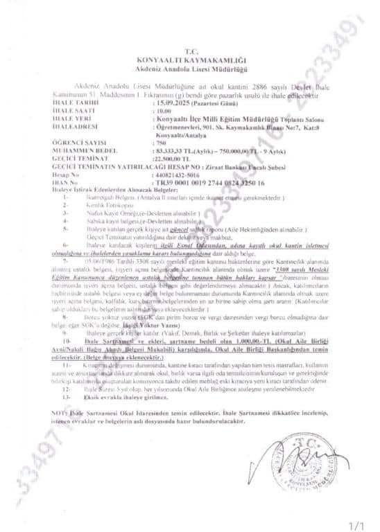 Kantin ihalesi duyurusu aşağıda yer almaktadır.